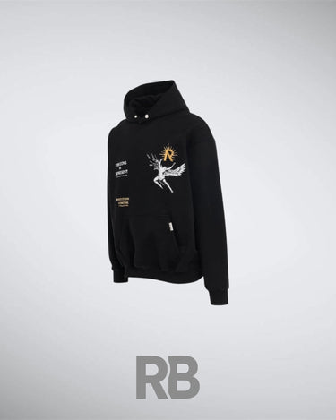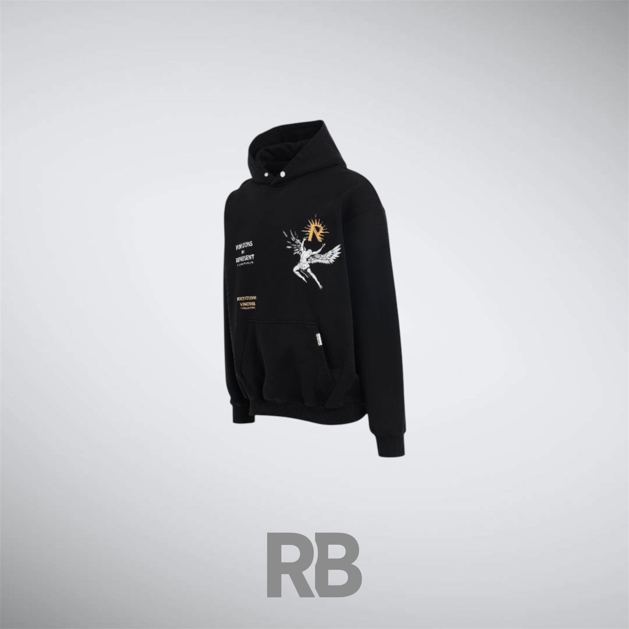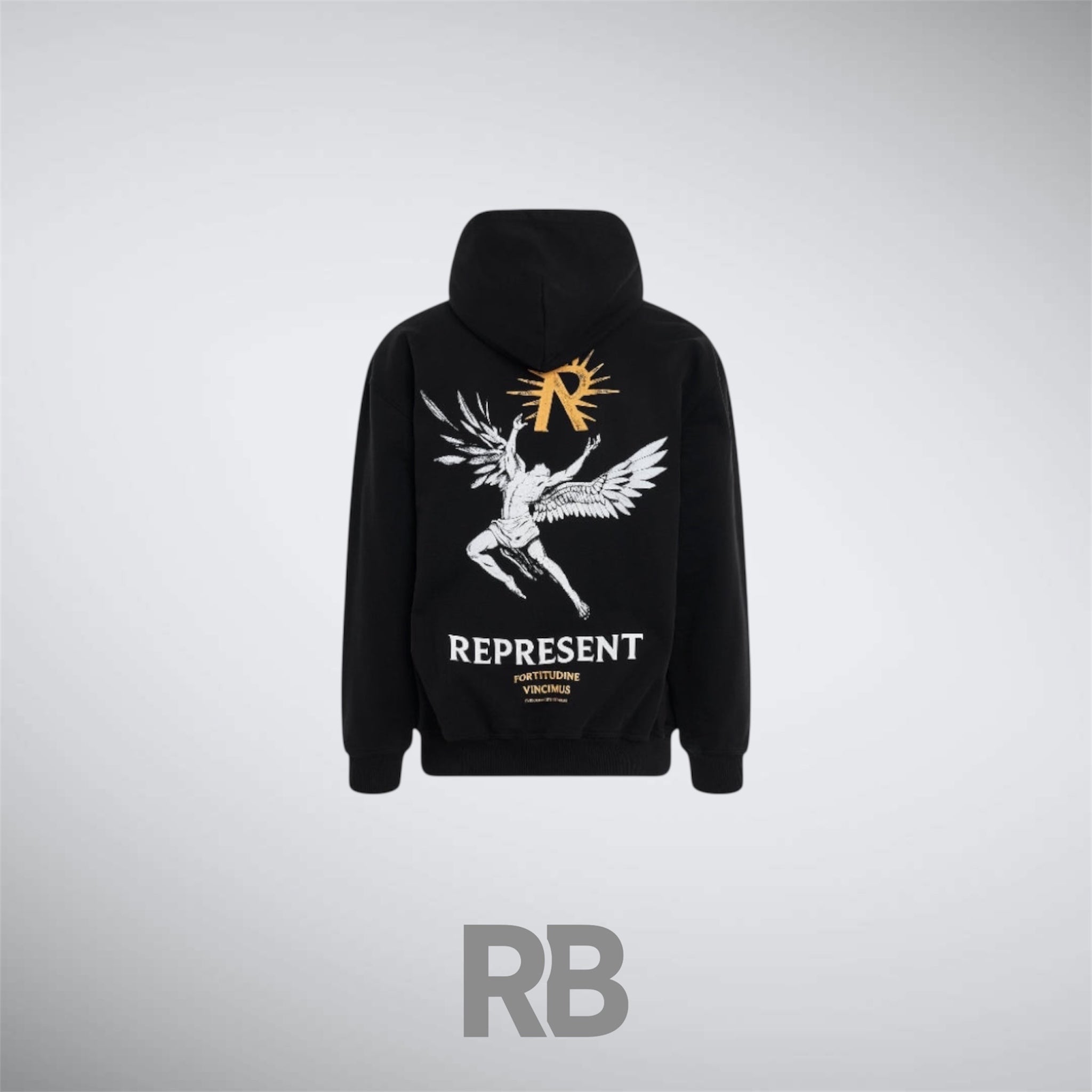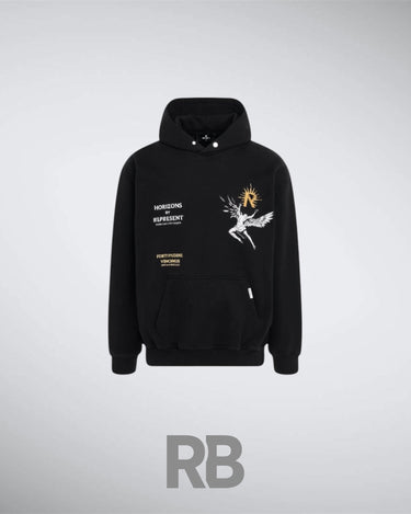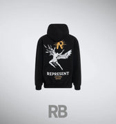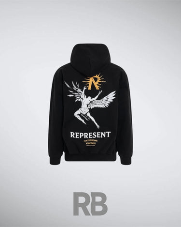 The Represent Icarus Black Hoodie is a luxury garment that combines comfort with a striking design. Crafted from 100% cotton with a substantial 480gsm weight, it offers a soft and durable feel. The hoodie features an oversized fit, ribbed hem and cuffs, and is adorned with a Cobrax popper on the hood and a Represent metal bar on the pocket. The front and back showcase a graphic of Icarus, symbolizing the balance between ambition and caution. This hoodie is available in jet black and is suitable for various occasions.