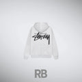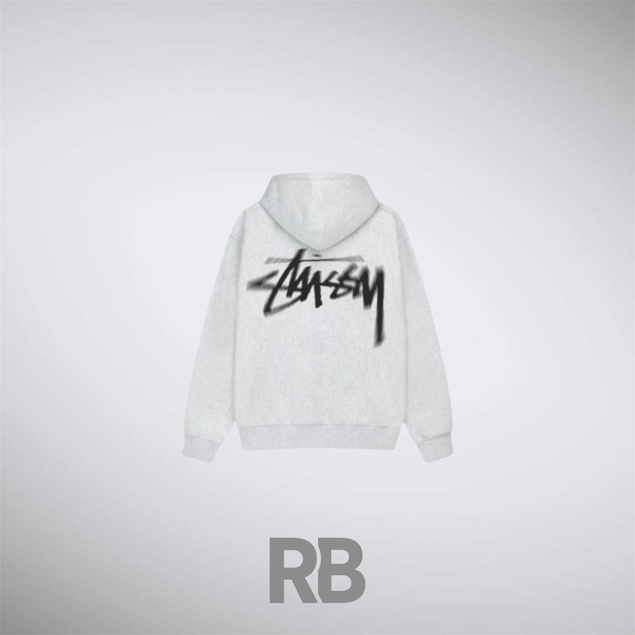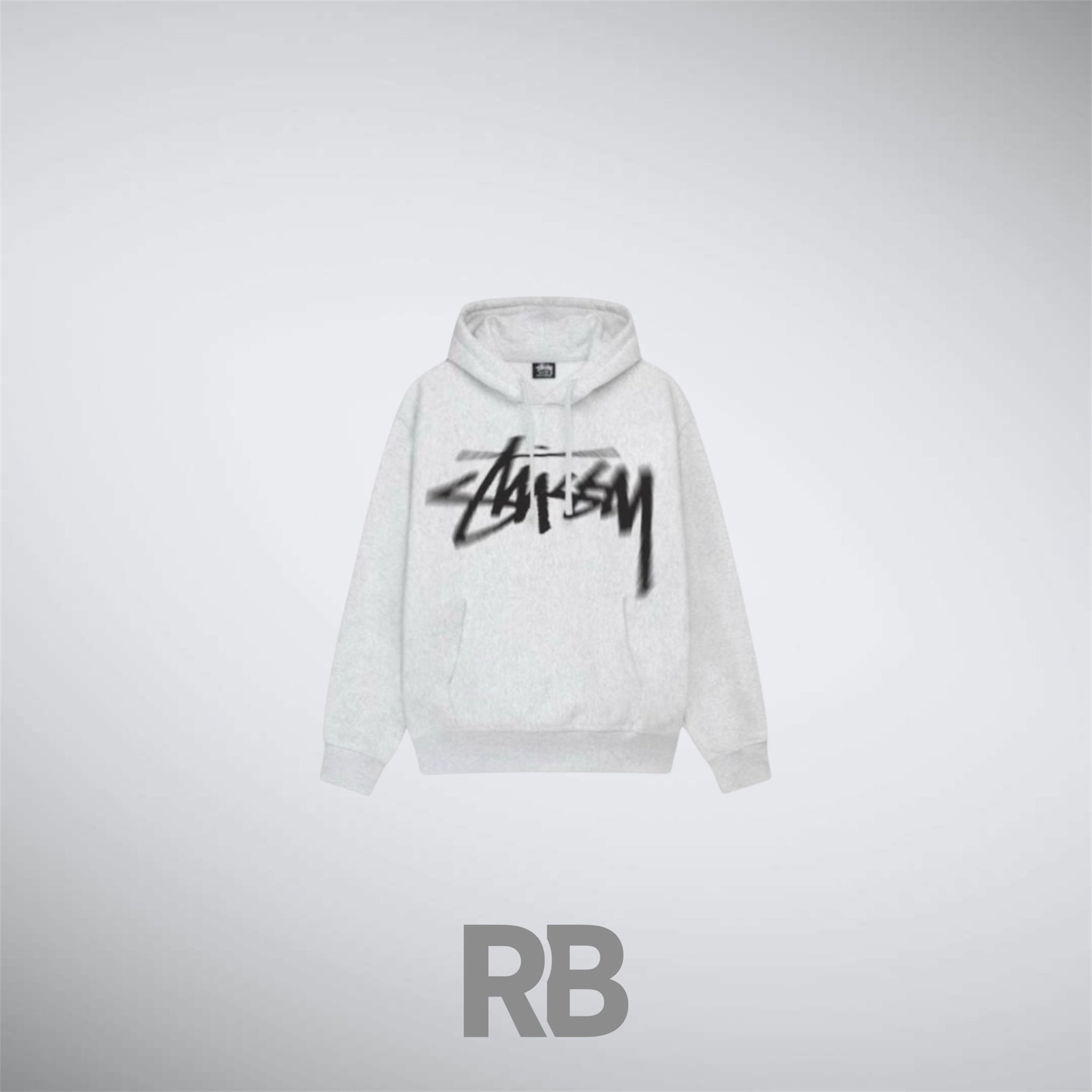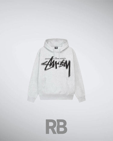 The stussy Dizzy Stock Hoodie in Ash Heather is a relaxed-fit, cotton-blend hoodie featuring a drawstring hood and kangaroo pocket. Its standout design element is the bold, black Dizzy stussy logo across the chest, creating a strong contrast against the soft grey fabric. It blends streetwear style with everyday comfort.