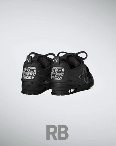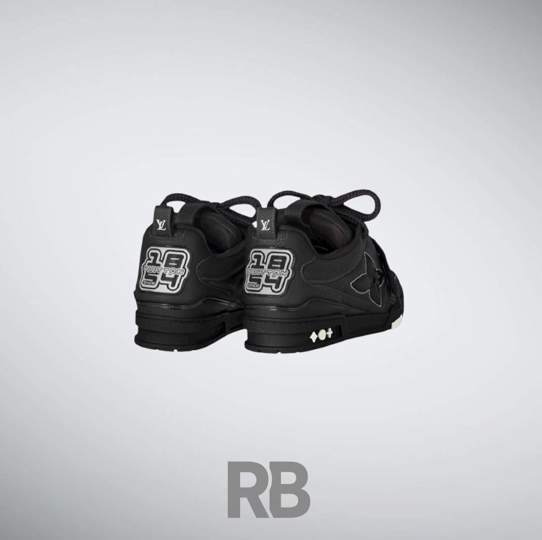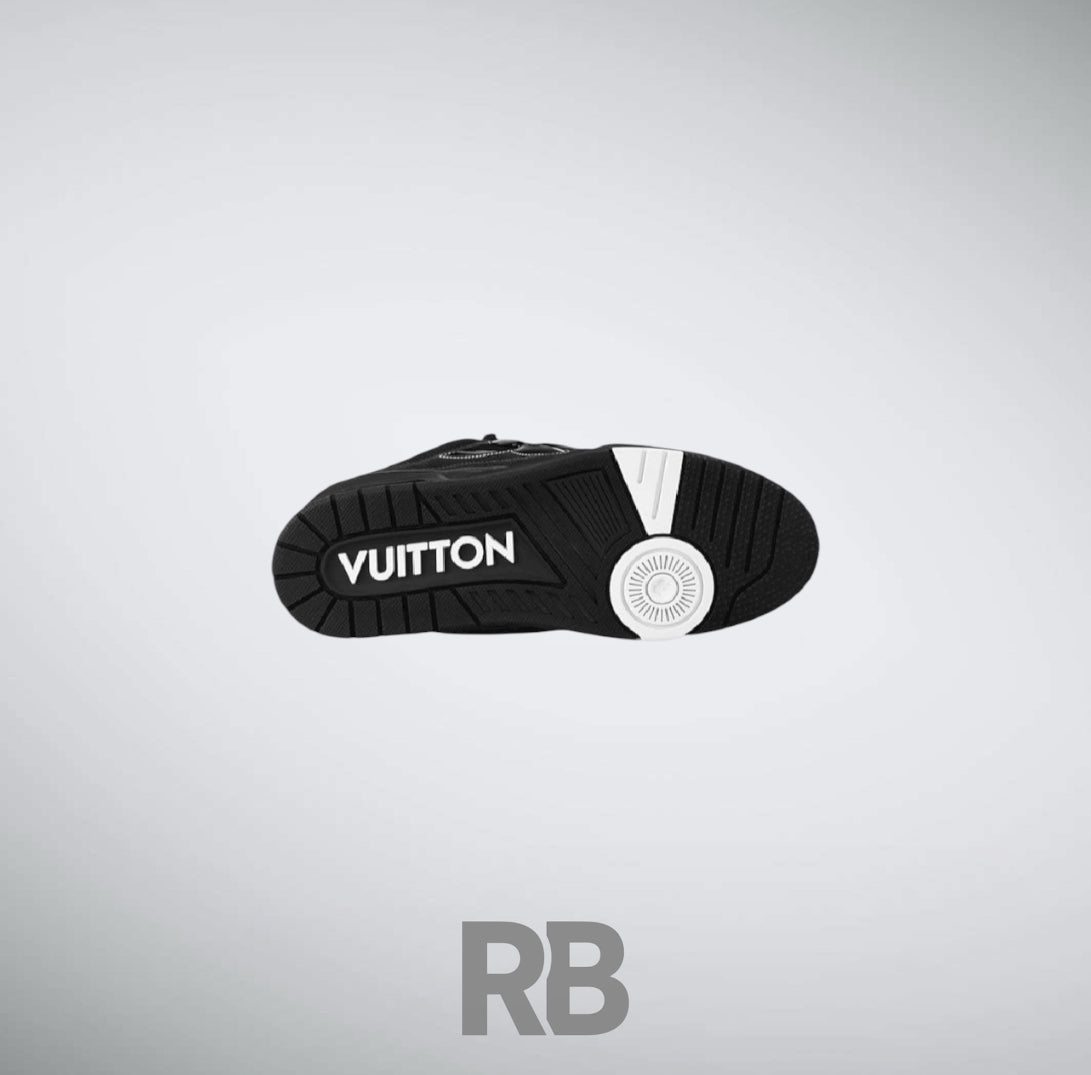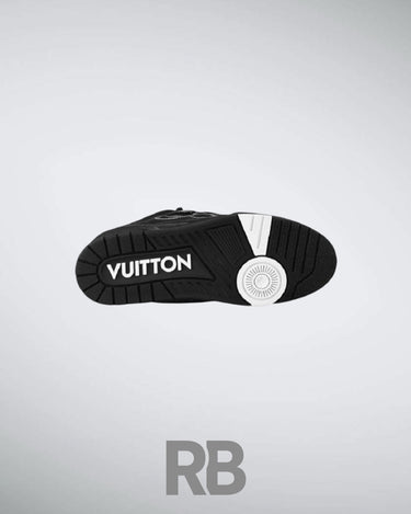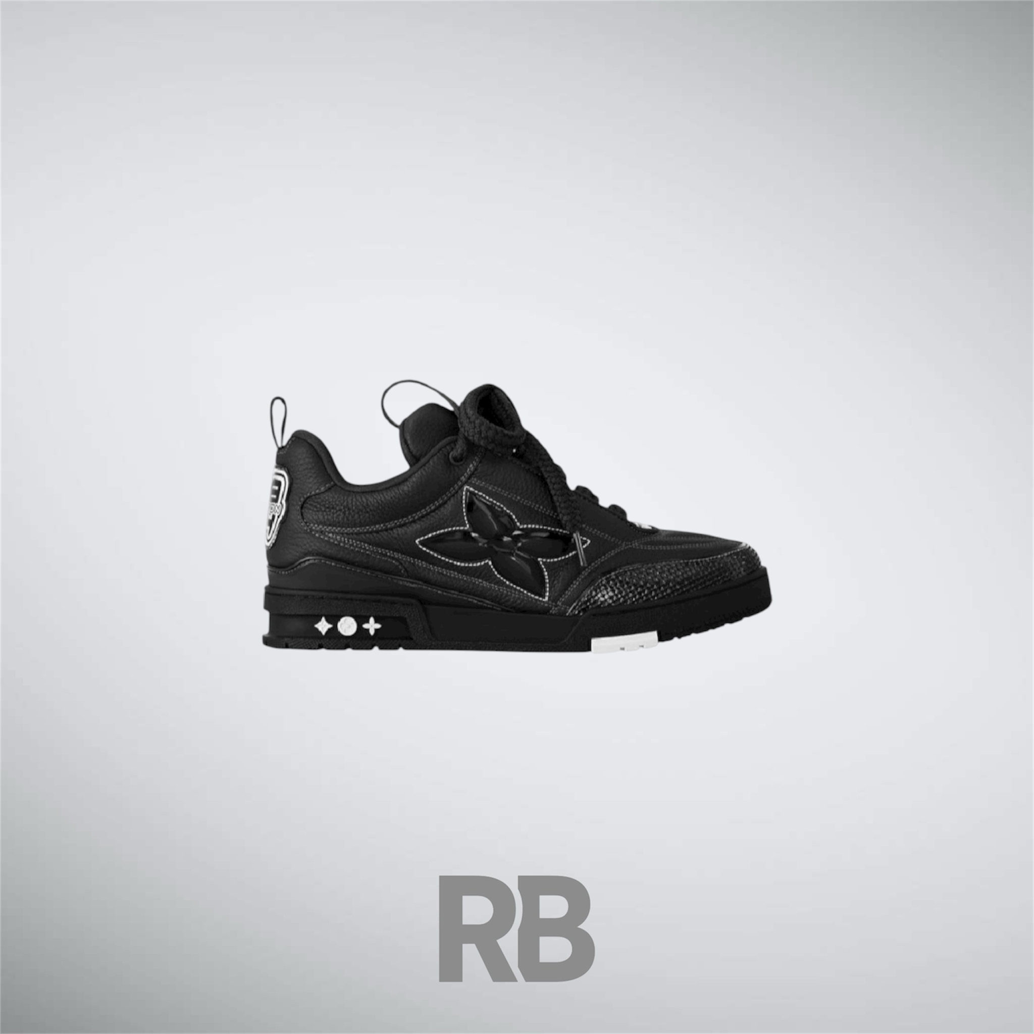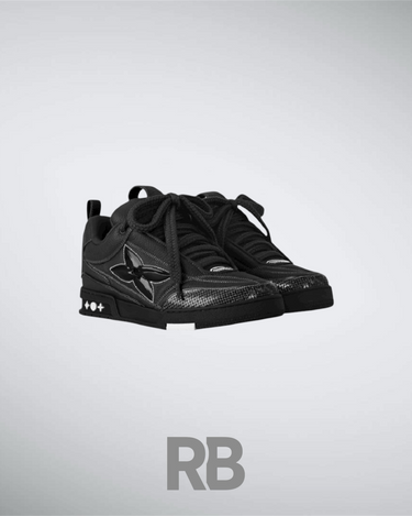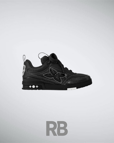 The LV Skate Black Sneaker is a luxury skate-inspired shoe featuring a black leather upper with Monogram embossing. Designed for comfort and style, it has a chunky rubber outsole, padded collar, and perforated details. With LV Initials and Monogram Flowers, it blends 90s skate culture with modern luxury, making it a versatile streetwear staple.