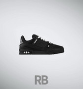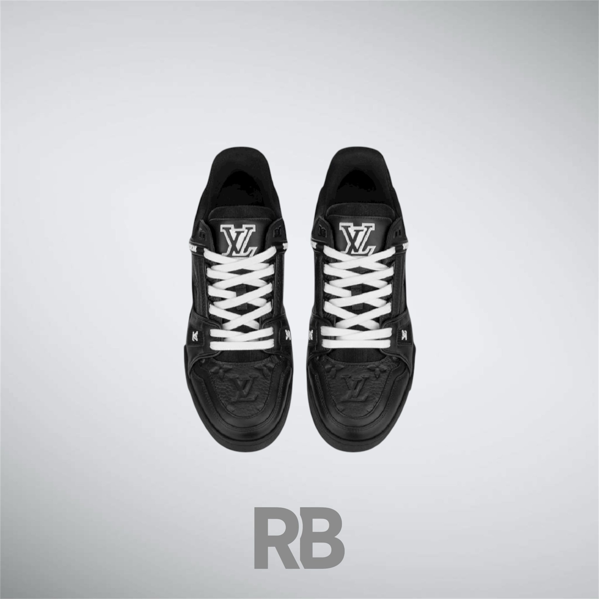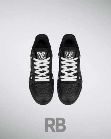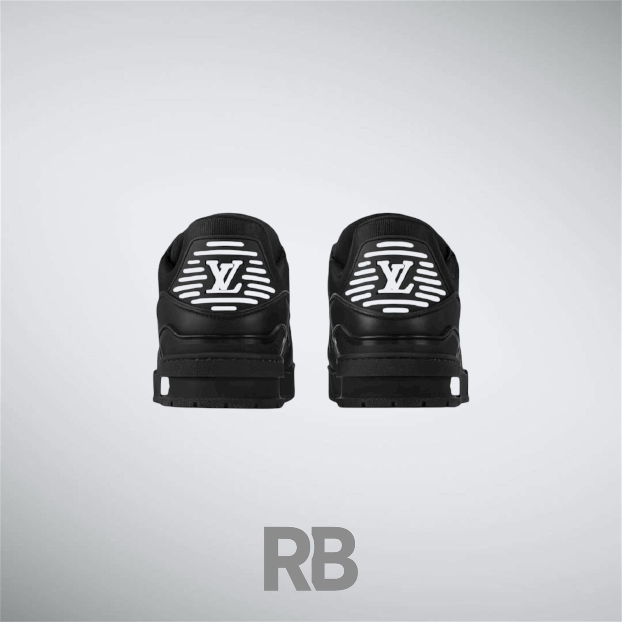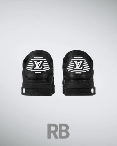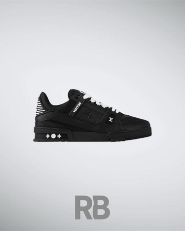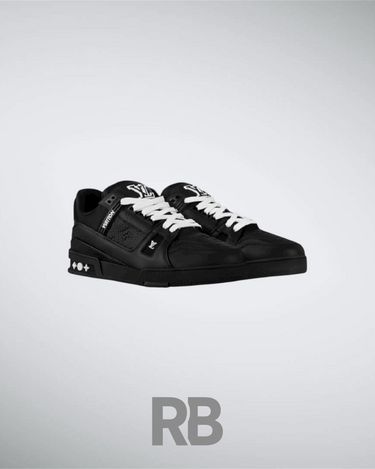 The Louis Vuitton Trainer Black Sneaker is a luxury sneaker inspired by vintage basketball shoes. Crafted from smooth black calf leather with embossed LV monogram patterns, it features tonal stitching, a padded collar, and a thick rubber outsole for durability. Subtle branding, including the LV logo and Louis Vuitton script, enhances its sleek, monochrome design. This versatile sneaker combines high-end craftsmanship with streetwear appeal.