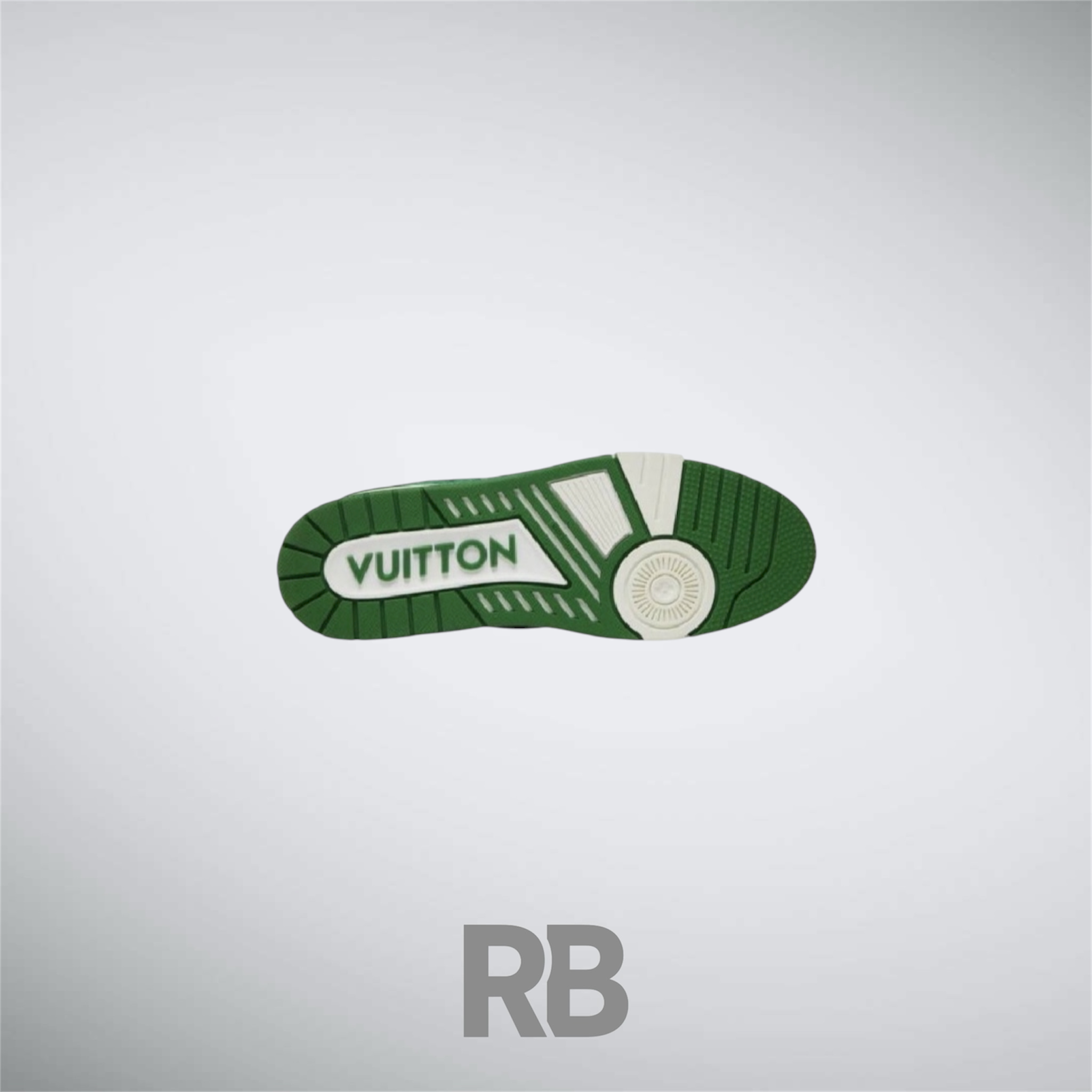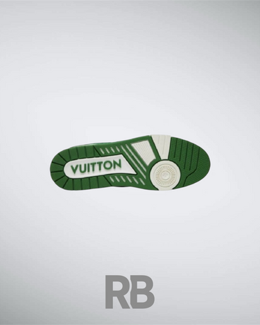 The LV Trainer Green Monogram Sneaker is a luxury basketball-inspired shoe designed by Virgil Abloh. It features embossed Monogram leather, a bold green colorway, and white and black accents. With a chunky rubber outsole, padded collar, and perforated toe box, it blends style and comfort. The 54 detail honors Louis Vuittons founding year, and the sneaker is handcrafted in Italy, making it a standout in high-fashion footwear.