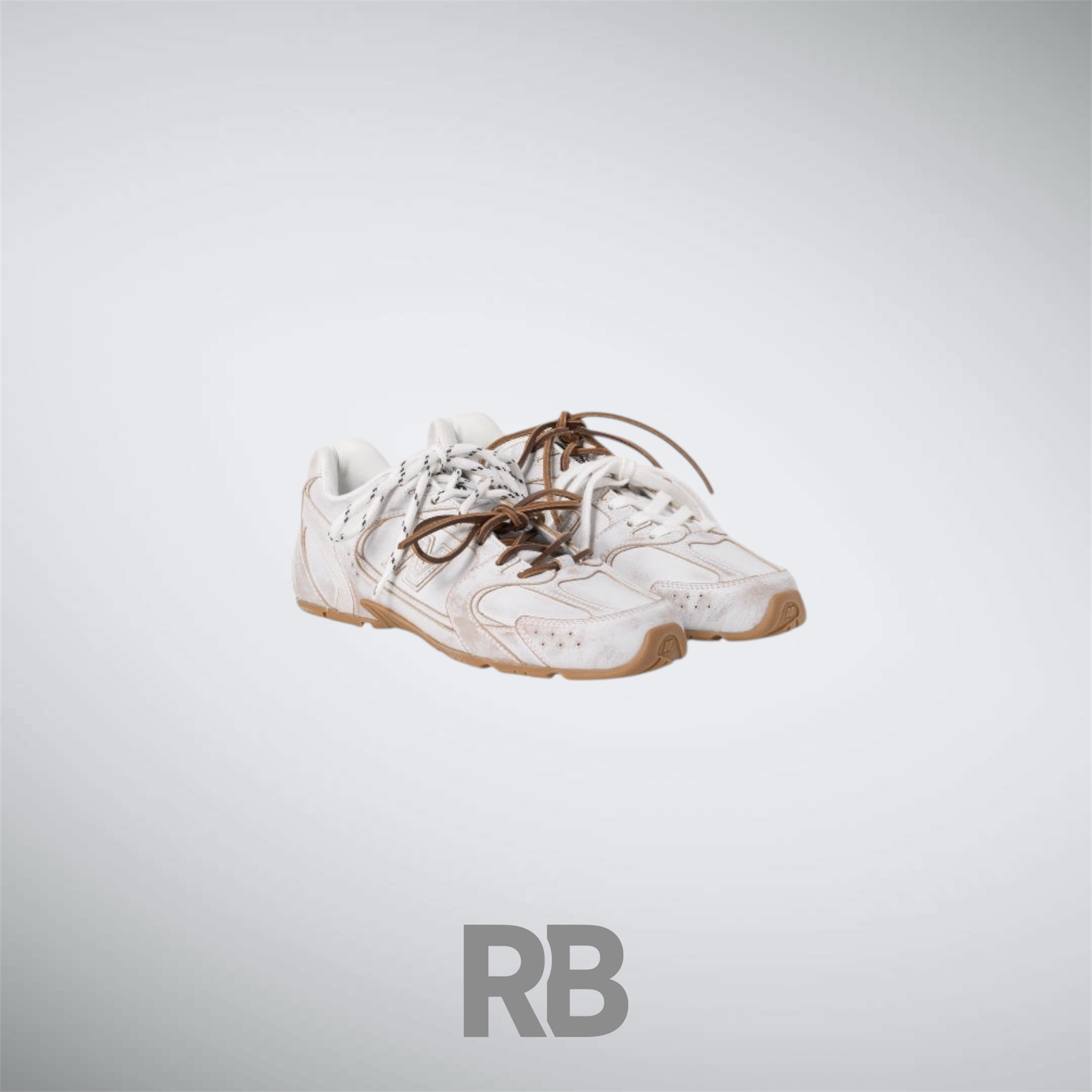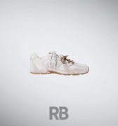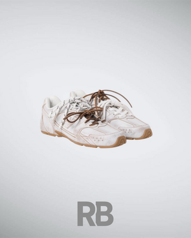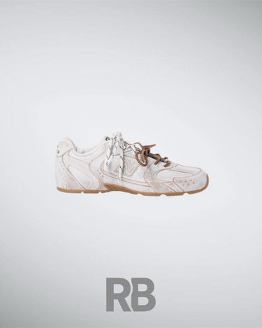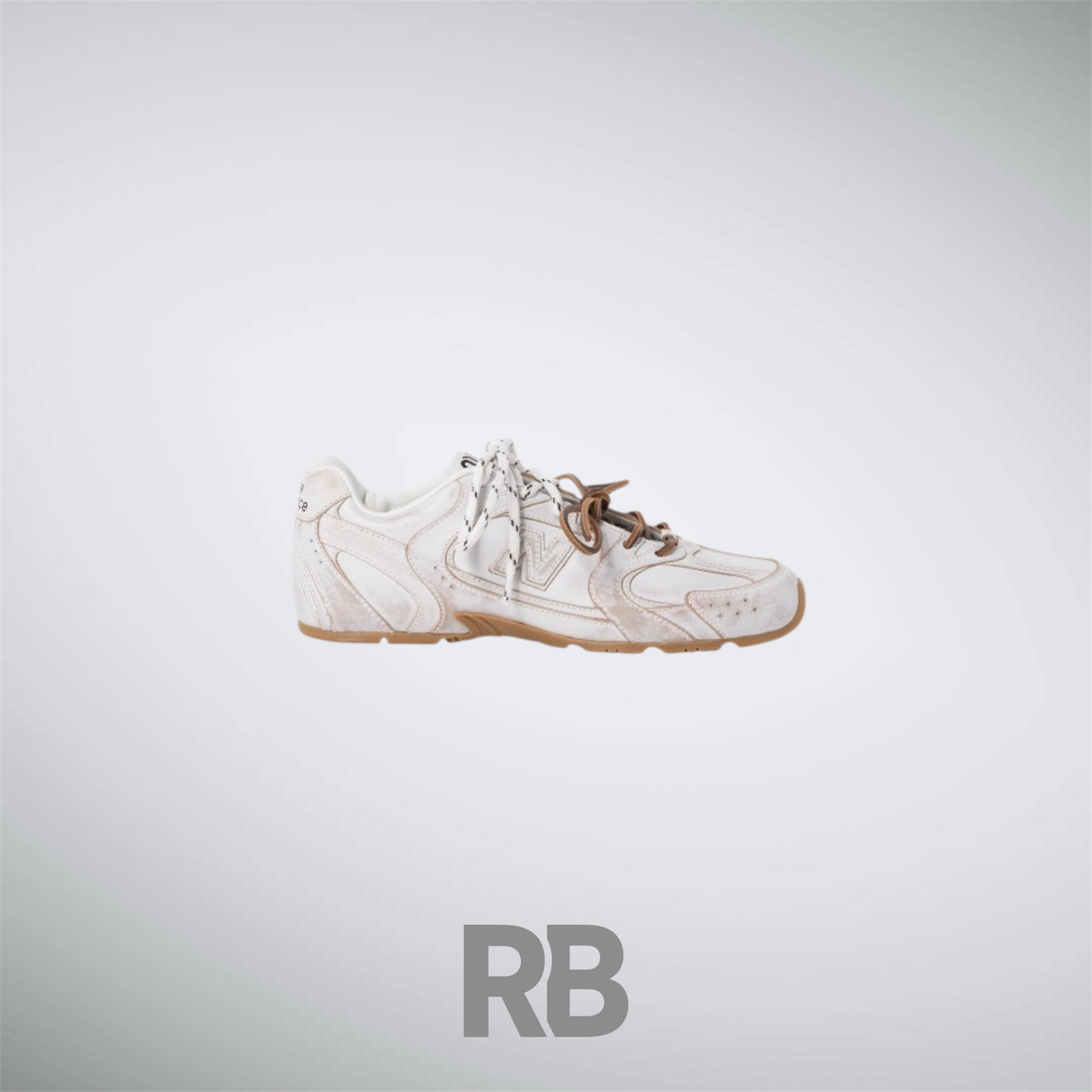 The New Balance x Miu Miu 530 SL Leather Sneaker is a distinctive collaboration that reimagines the classic 530 silhouette with a contemporary twist. Originally introduced as a performance shoe in the 1990s, the 530 has been transformed by Miu Miu into an ultra-lightweight, flat-soled sneaker featuring a vintage-effect leather upper. This design is complemented by contrasting laces and co-branded logos