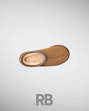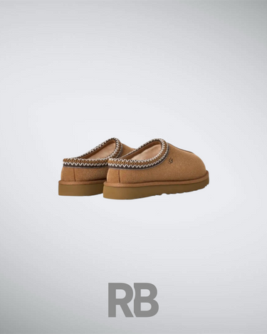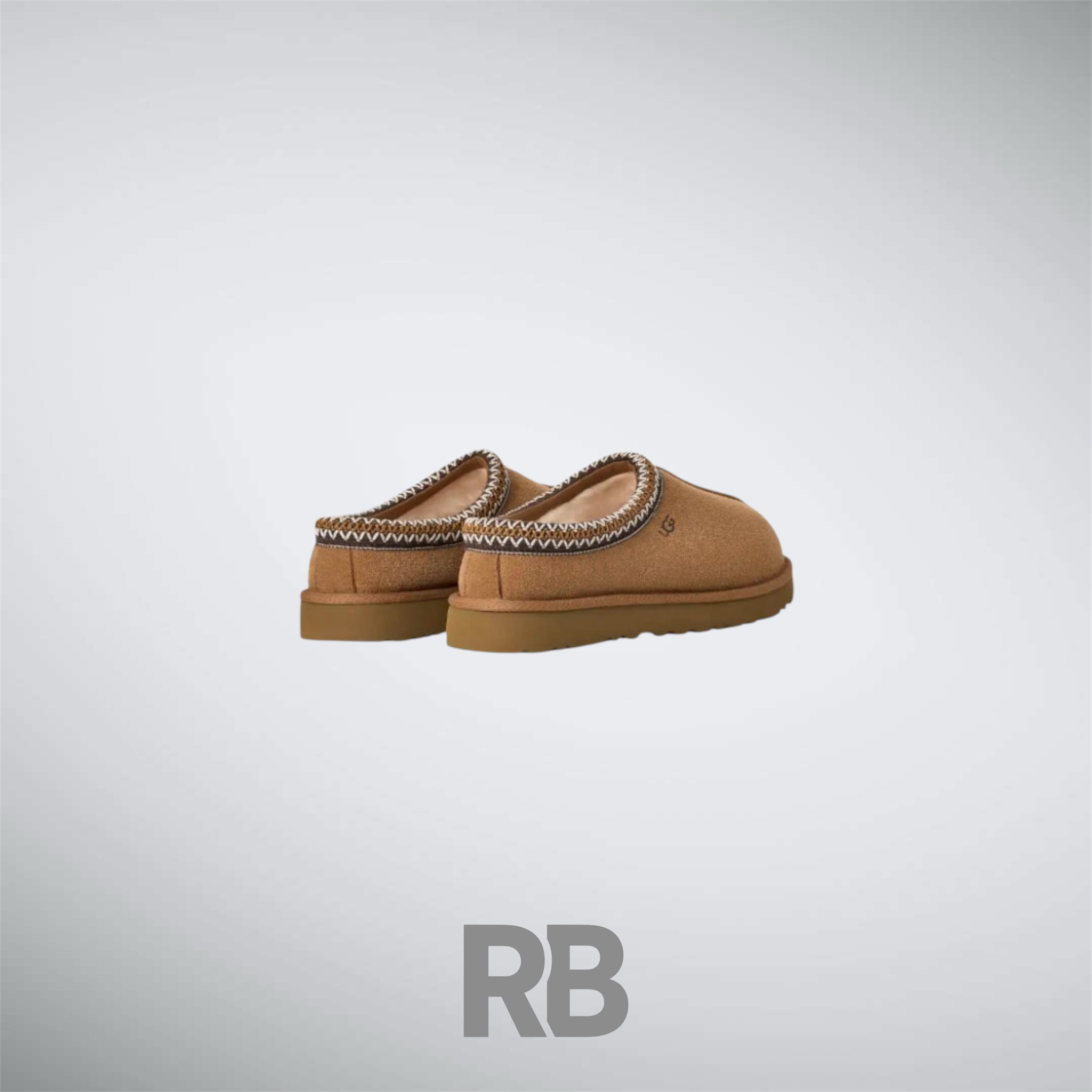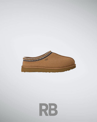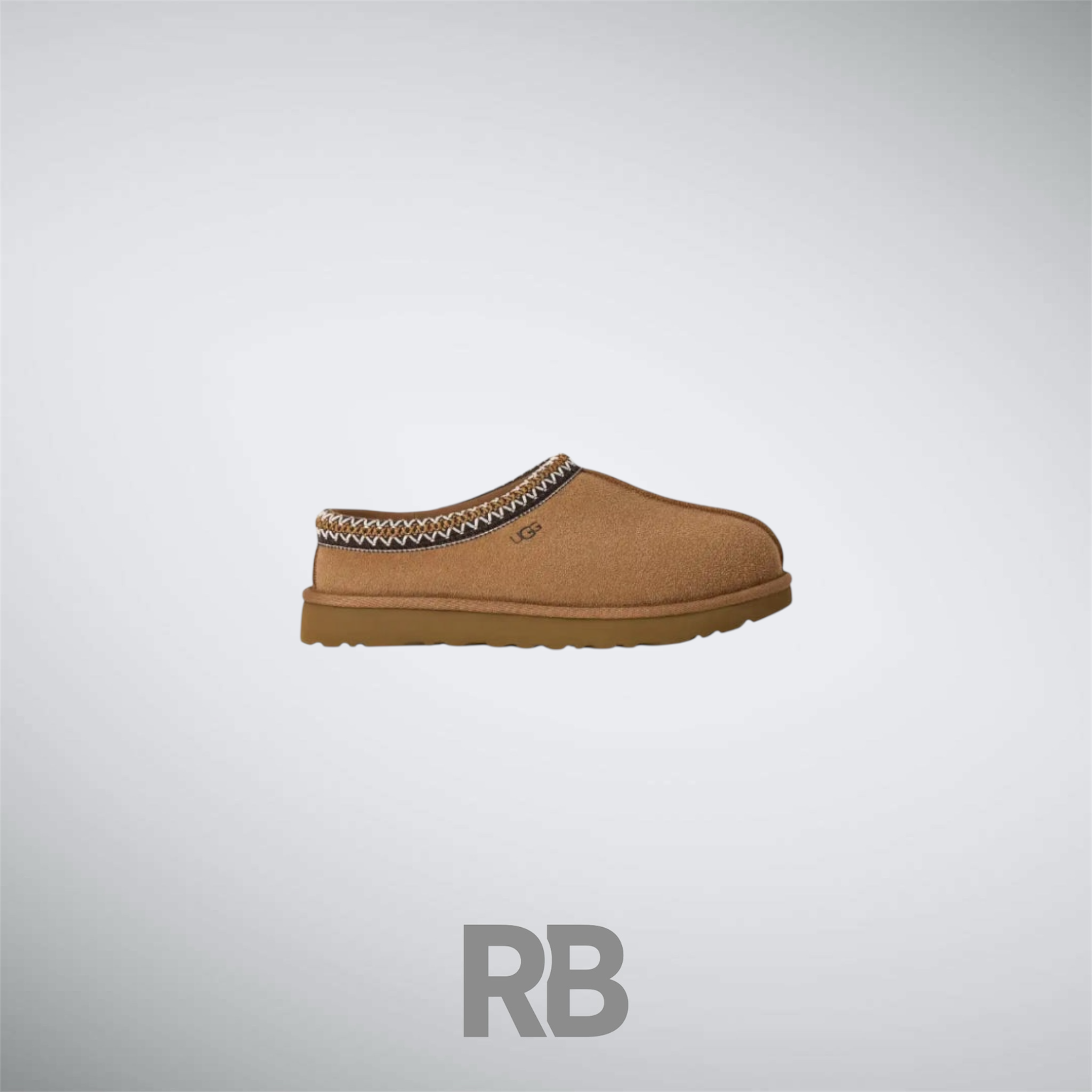 The UGG Tasman Slipper in Chestnut features a suede upper, plush sheepskin lining, and a durable Treadlite by UGG outsole for indoor and outdoor wear. A braided stitch detail adds a stylish touch, making it a cozy and versatile essential.