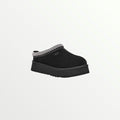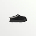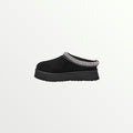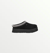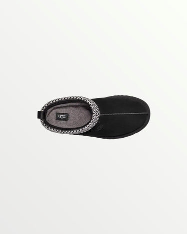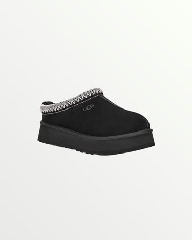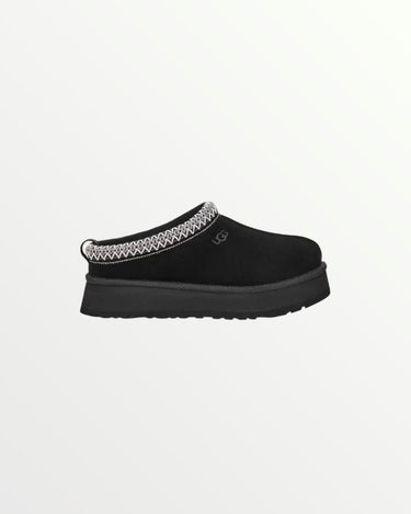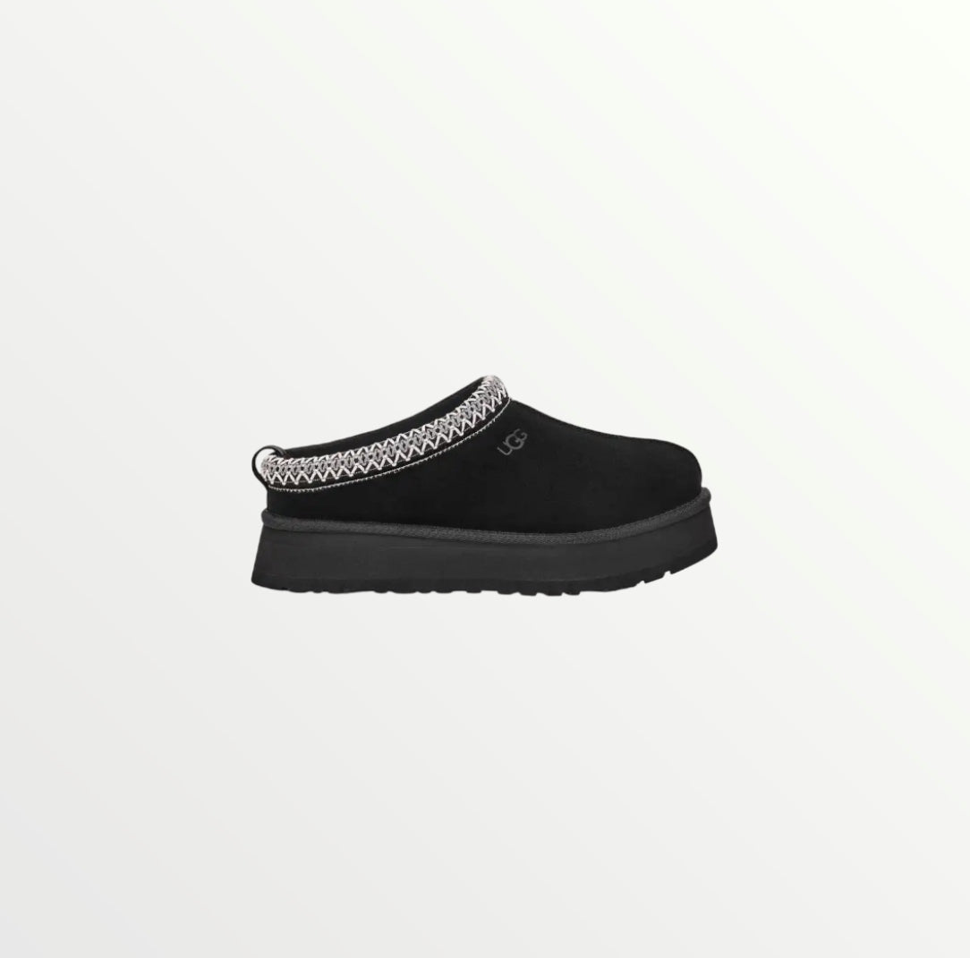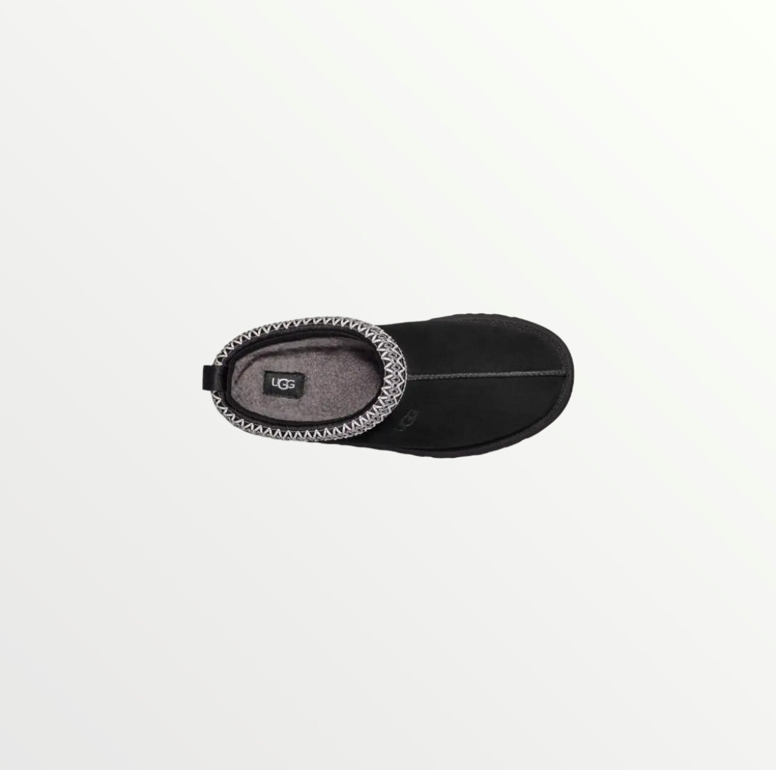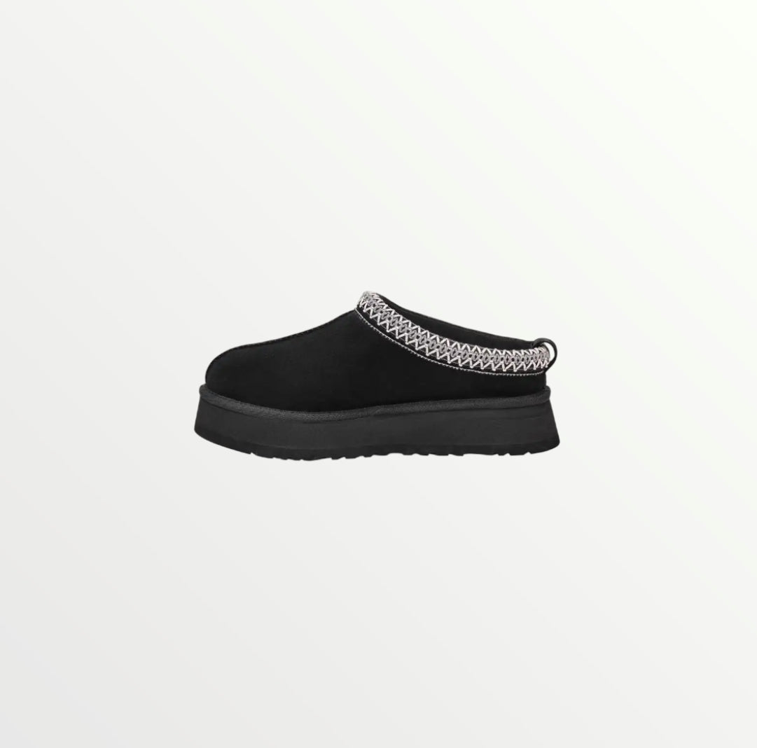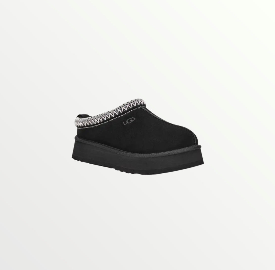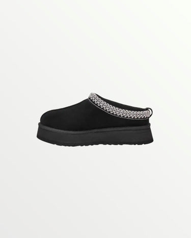 The UGG Tazz in Black is a stylish platform slipper with a suede upper, plush sheepskin lining, and a 1.5-inch EVA sole for added height and comfort. A braided stitch detail enhances its sleek design, making it perfect for lounging or casual wear.