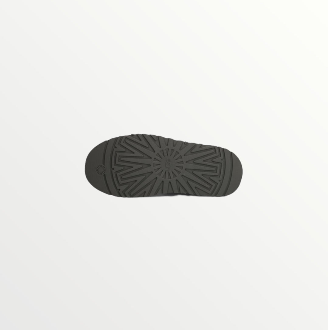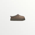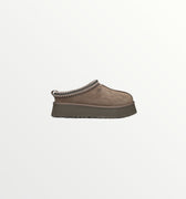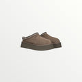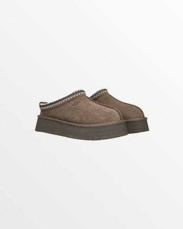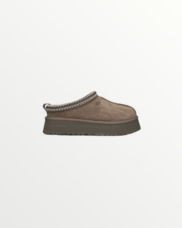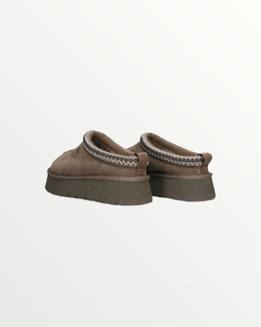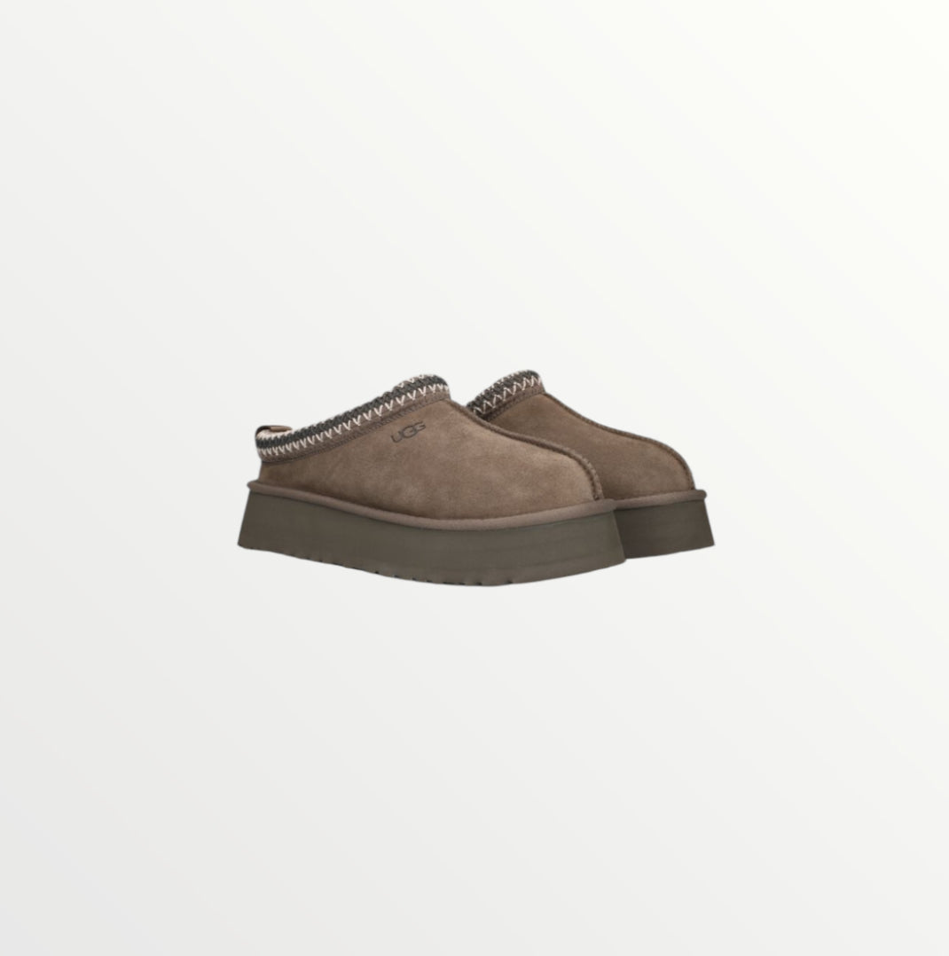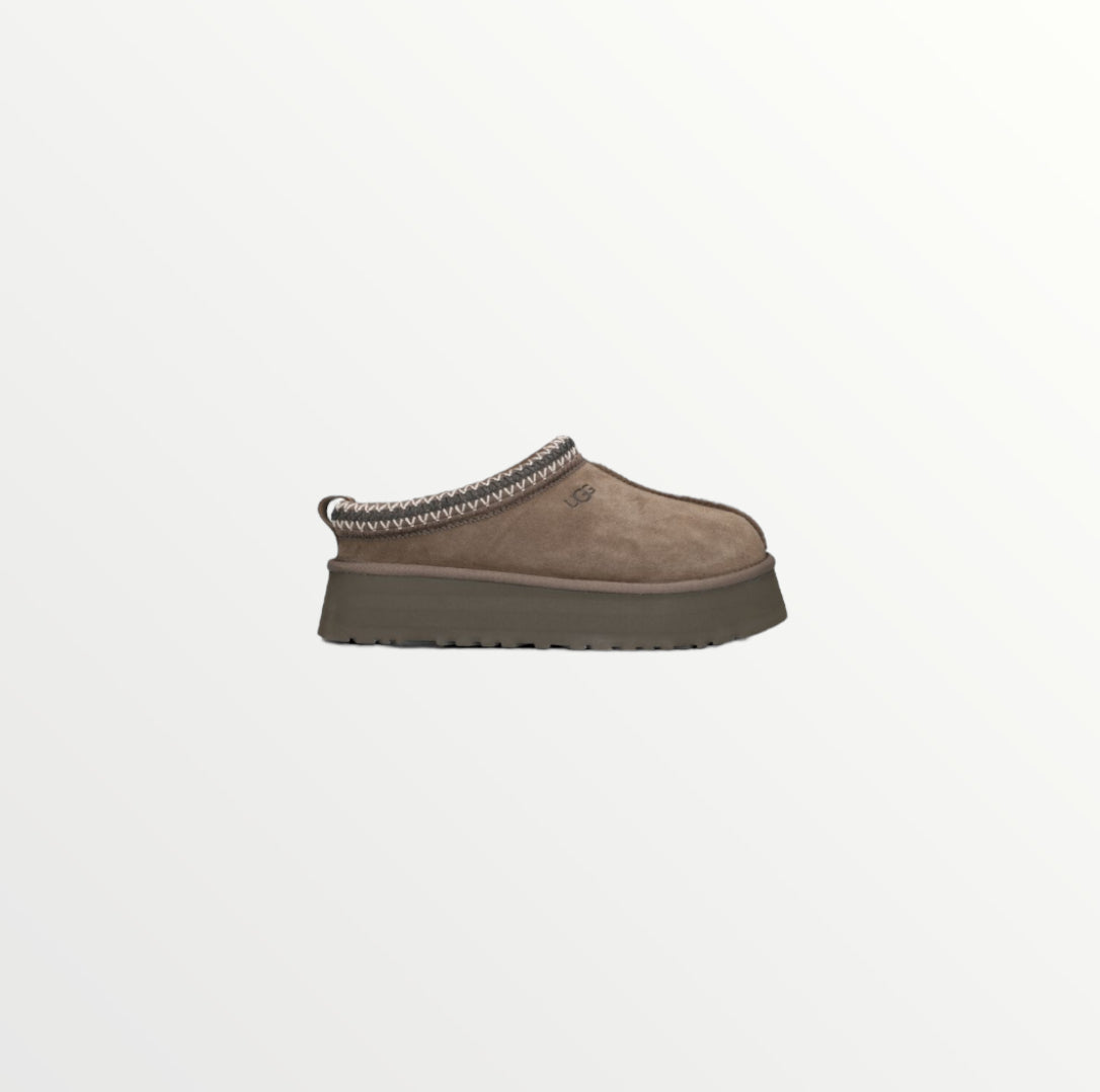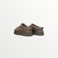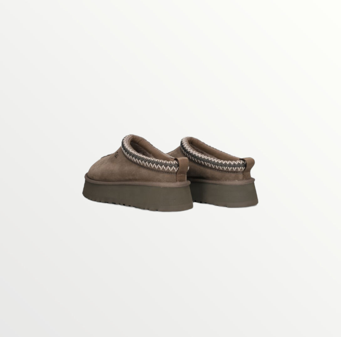 The UGG Tazz in brown is a cozy platform slipper with a suede upper, plush sheepskin lining, and a 1.5-inch EVA sole for added height and comfort. It features a braided stitch detail for a stylish touch, making it perfect for both indoor and casual outdoor wear.