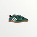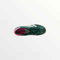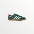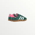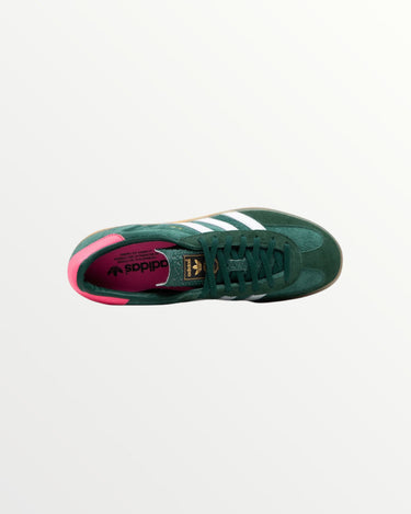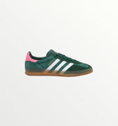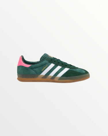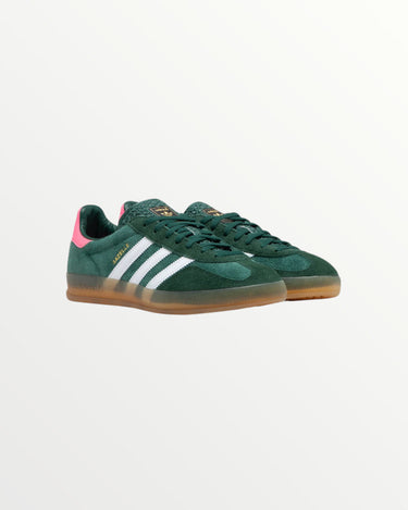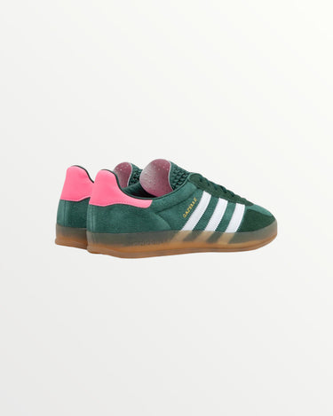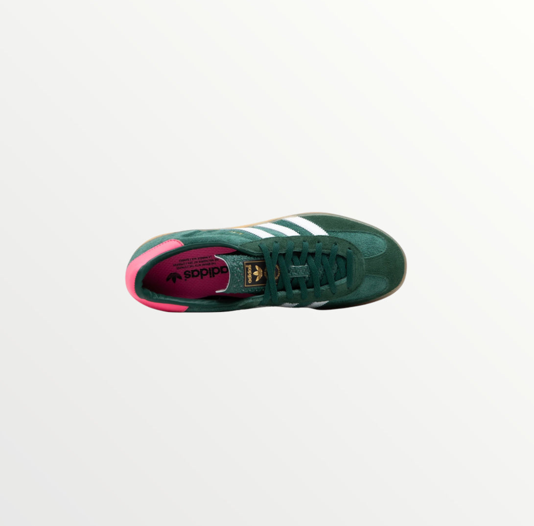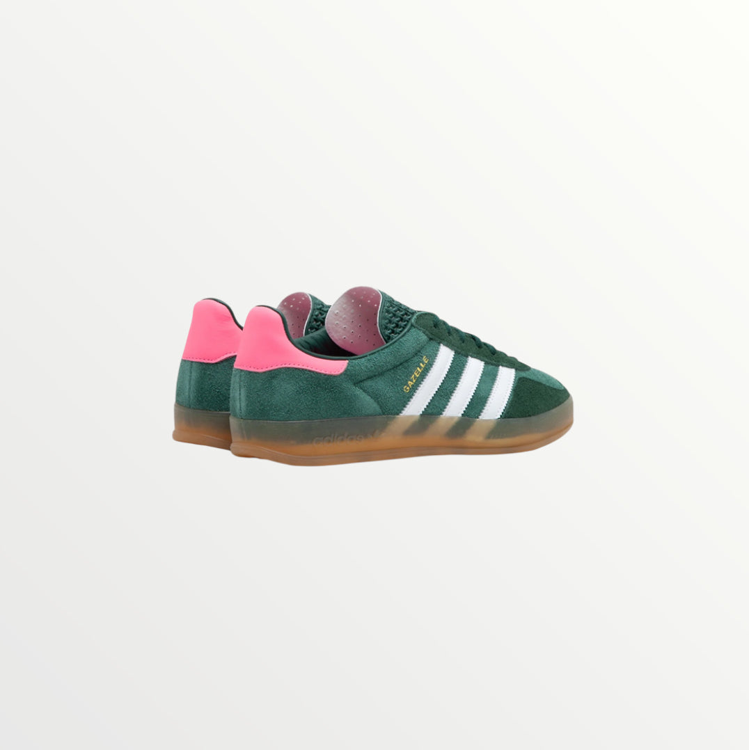The Adidas Gazelle Indoor in Collegiate Green and Lucid Pink features a green suede upper with vibrant pink accents on the stripes and tongue. Its low-profile design and rubber outsole offer both style and comfort, blending retro charm with modern flair.