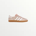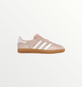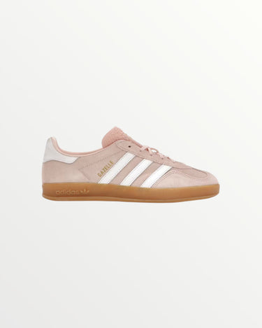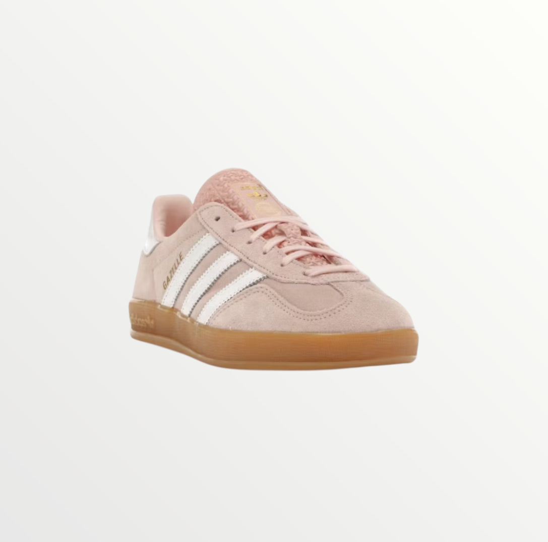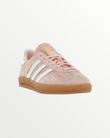 The Adidas Gazelle Indoor in Sandy Pink features a soft suede upper, classic three-stripe branding, and a white rubber outsole. Its stylish and subtle colorway, along with a cushioned insole and durable sole, makes it a comfortable and fashionable choice for casual wear or light activity.