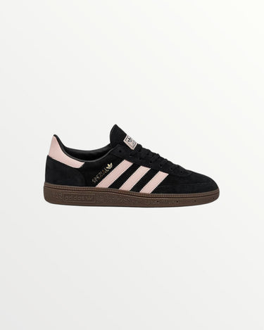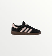 The Adidas Handball Spezial Core Black is a classic sneaker with a sleek black suede upper, white three-stripe branding, and a gum rubber outsole for excellent grip. It combines retro style with modern comfort, featuring a cushioned insole and padded collar for support. Ideal for casual wear or street style, it offers a timeless design with breathable perforated details.