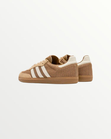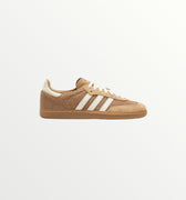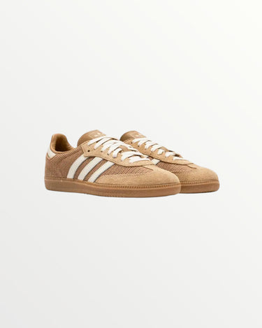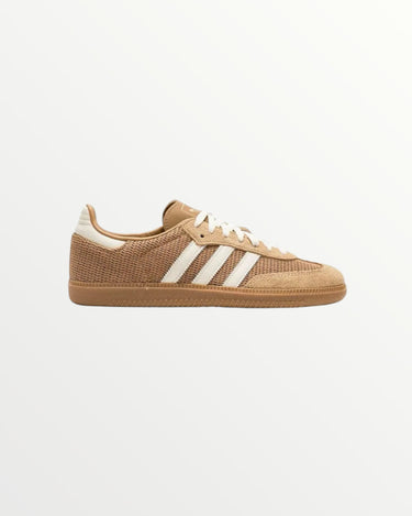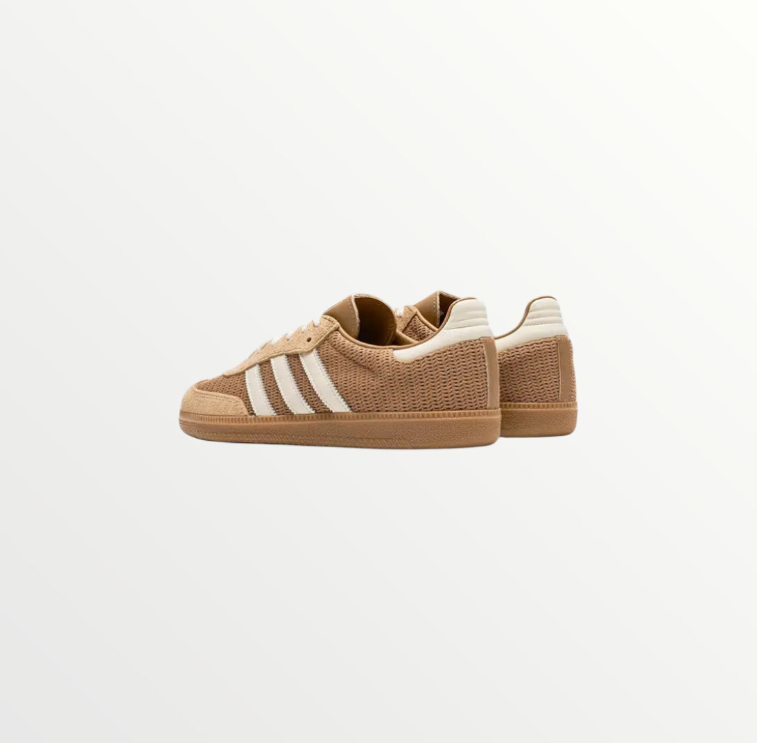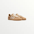 The Adidas Samba OG Cardboard features a retro-inspired design with a neutral-toned, cardboard-colored upper made of suede and leather. It includes the iconic three stripes and a durable gum rubber outsole. This sneaker combines classic style with modern appeal, perfect for both sport and street wear.