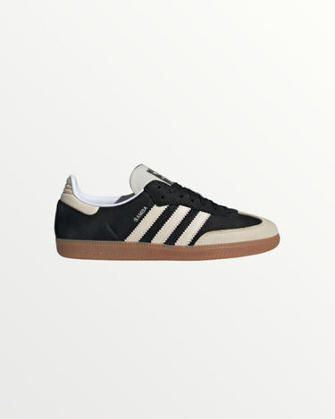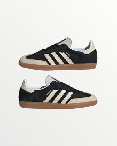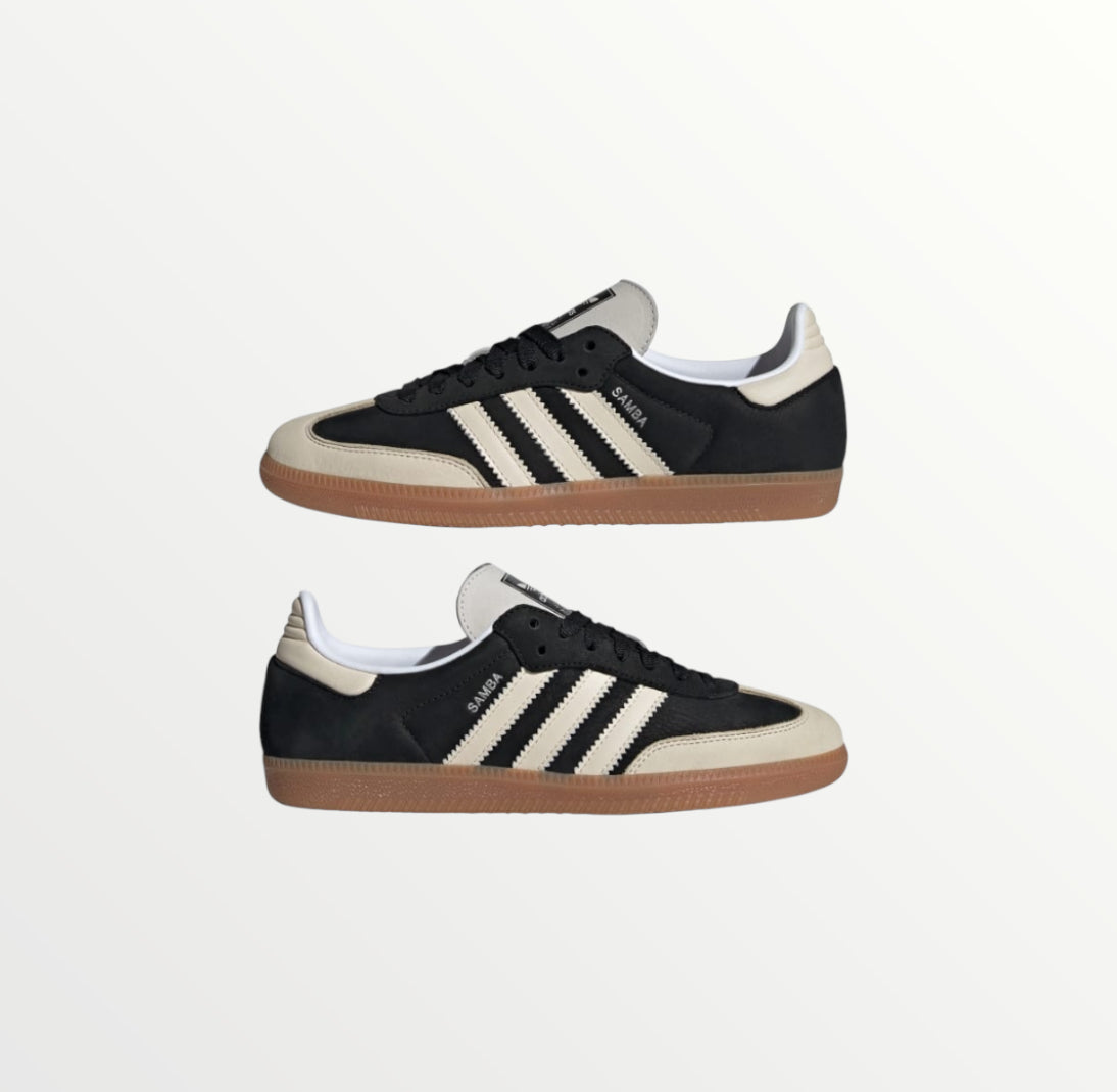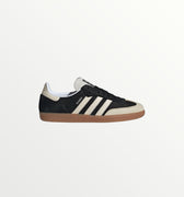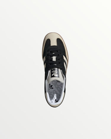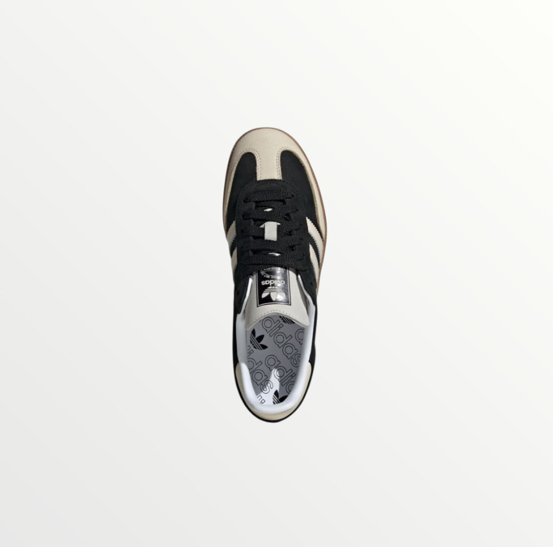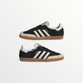 The Adidas Samba Wonder White features a white leather upper with black suede accents, iconic three-stripes, and a gum rubber outsole for durability. It combines classic design with modern style, offering a retro aesthetic with added comfort.