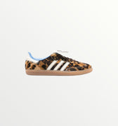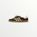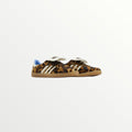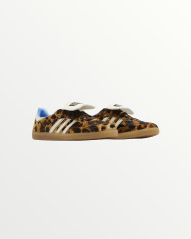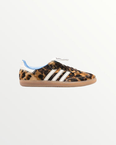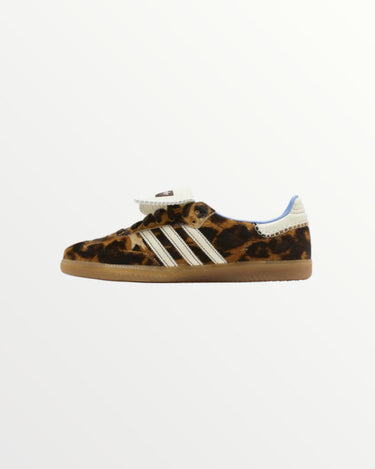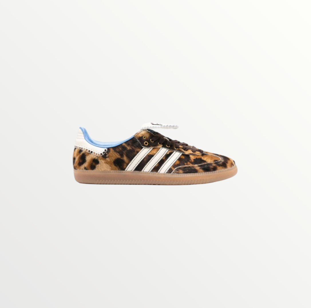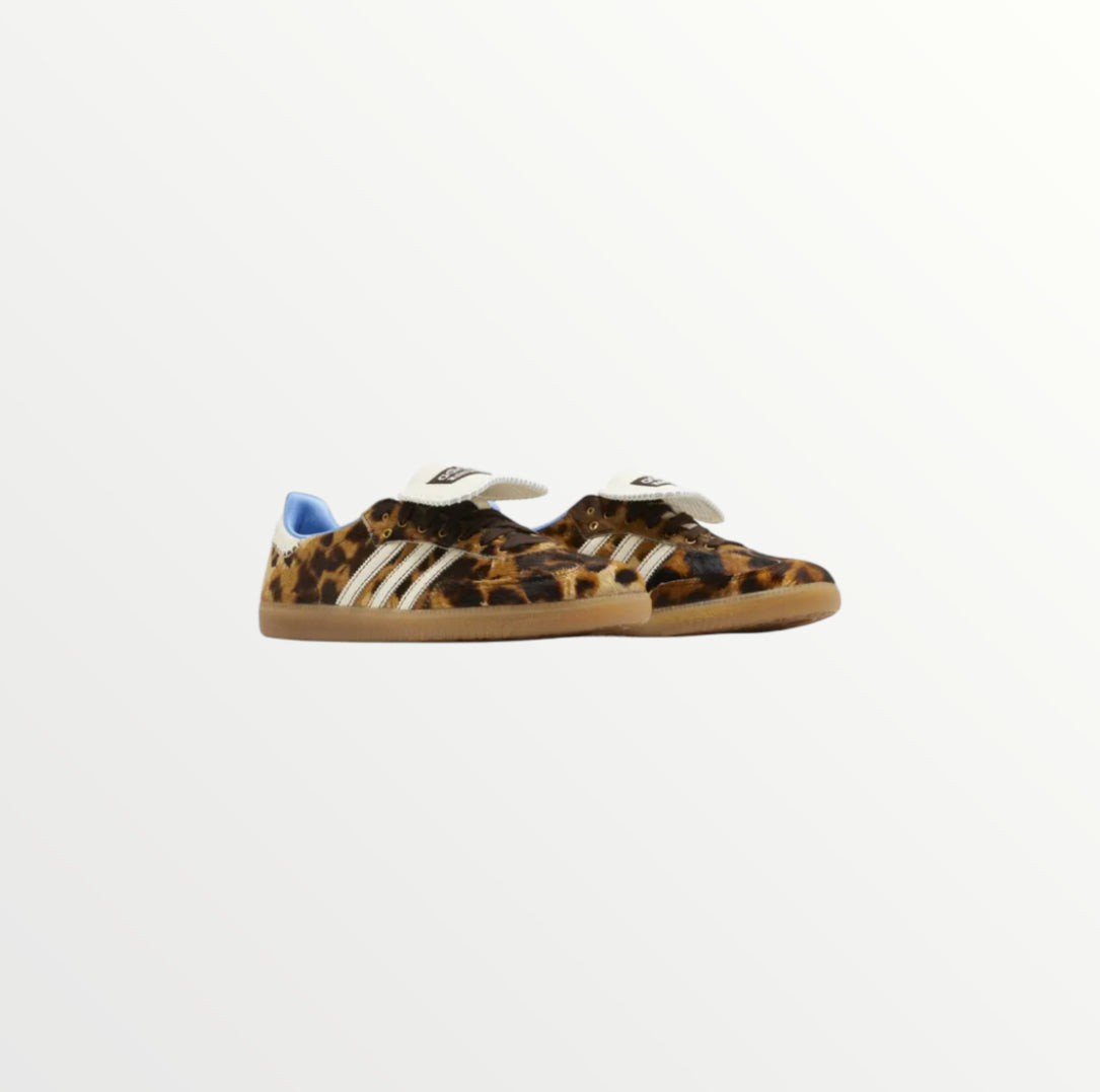 The Adidas x Wales Bonner Samba Pony Tonal Leopard is a collaboration featuring a premium pony hair upper with a tonal leopard print, blending luxury and bold design. It retains the classic Samba silhouette with white leather accents and subtle co-branding details, offering a stylish mix of sport and high fashion.